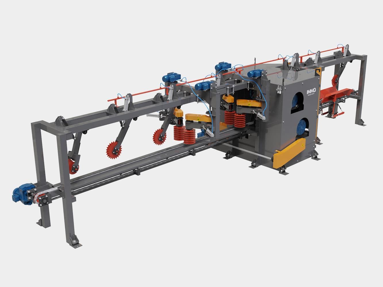 As costaneiras são separadas da máquina e seguem para uma linha paralela, enquanto o semi-bloco continua na linha principal.